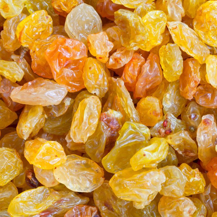 Raisins are dried grapes, typically dark brown or golden in color, depending on the grape variety and drying method. They have a sweet, concentrated flavor with a chewy texture. The drying process intensifies their natural sugars, resulting in a rich, caramel-like taste. Raisins are often used in baking, cooking, and as a snack, adding both sweetness and depth to dishes like cookies, cakes, salads, and rice pilafs.